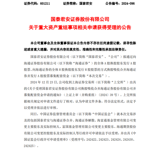 两家公司发布的公告表示,12月23日,收到上交所出具的《对于受理国泰君安证券股份有限公司换股经受归并海通证券股份有限公司并召募配套资金肯求的见告》。上交所依据干系限定对肯求文献进行了查对,以为肯求文献透彻,合适法定时势,决定赐与受理并照章进行审核。